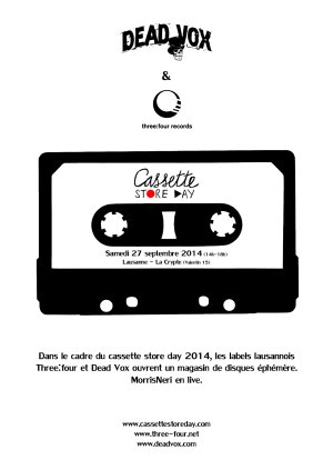Le samedi 27 septembre, Three:four records et Dead Vox organisent un événement pour le cassette store day 2014. Ce jour, de 14 heures à 18 heures, le QG de Dead Vox sera transformé en un magasin de disques éphémère où vous pourrez découvrir des cd’s, cassettes et vinyles de différents labels (Three:four, Dead Vox, Old Bicycle recordings, Feathered coyote records, …).